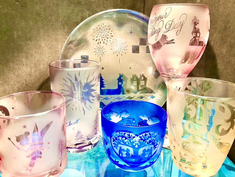 形の出来上がったガラス器に砂(研磨剤)を空気圧で吹き付け、絵柄や文字を彫刻する教室です。